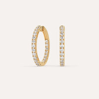 Timeless, everyday 2 carat total diamond 24mm hoop earrings for women, set with high brilliance white and eye clean natural diamonds in solid 14K yellow gold.
