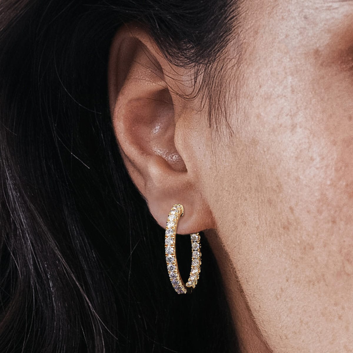 Timeless, everyday 2 carat total diamond 30mm, single hoop earring for women, set with high brilliance white and eye clean natural diamonds in solid 14K yellow gold.