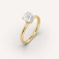 Hidden Halo 2 carat cushion cut engagement ring, set with a high brilliance white and eye clean lab diamond in solid 14K yellow gold.