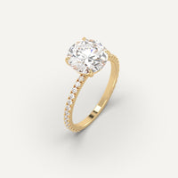 Pave 3 carat round cut engagement ring, set with a high brilliance white and eye clean lab diamond in solid 14K yellow gold.