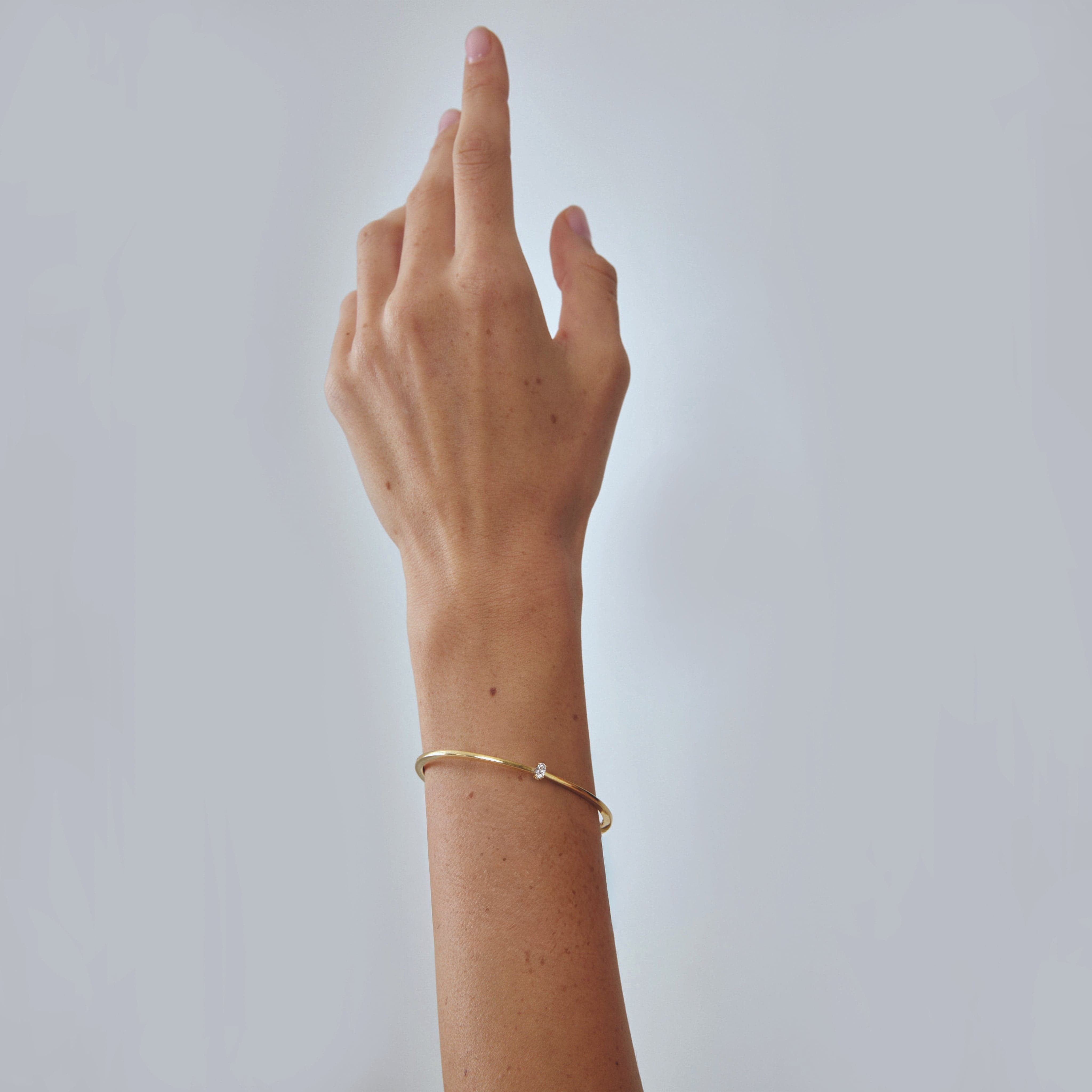 This minimalist solitaire diamond bangle bracelet is designed with a 2.3" (6cm) oval diameter that won't spin around and fits any wrist. Perfect alone or stacked, it's a versatile touch of sophistication.
