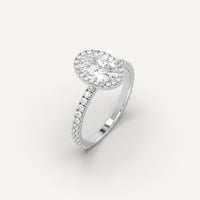 Halo 1 carat oval cut engagement ring, set with a high brilliance white and eye clean lab diamond in solid 950 platinum.
