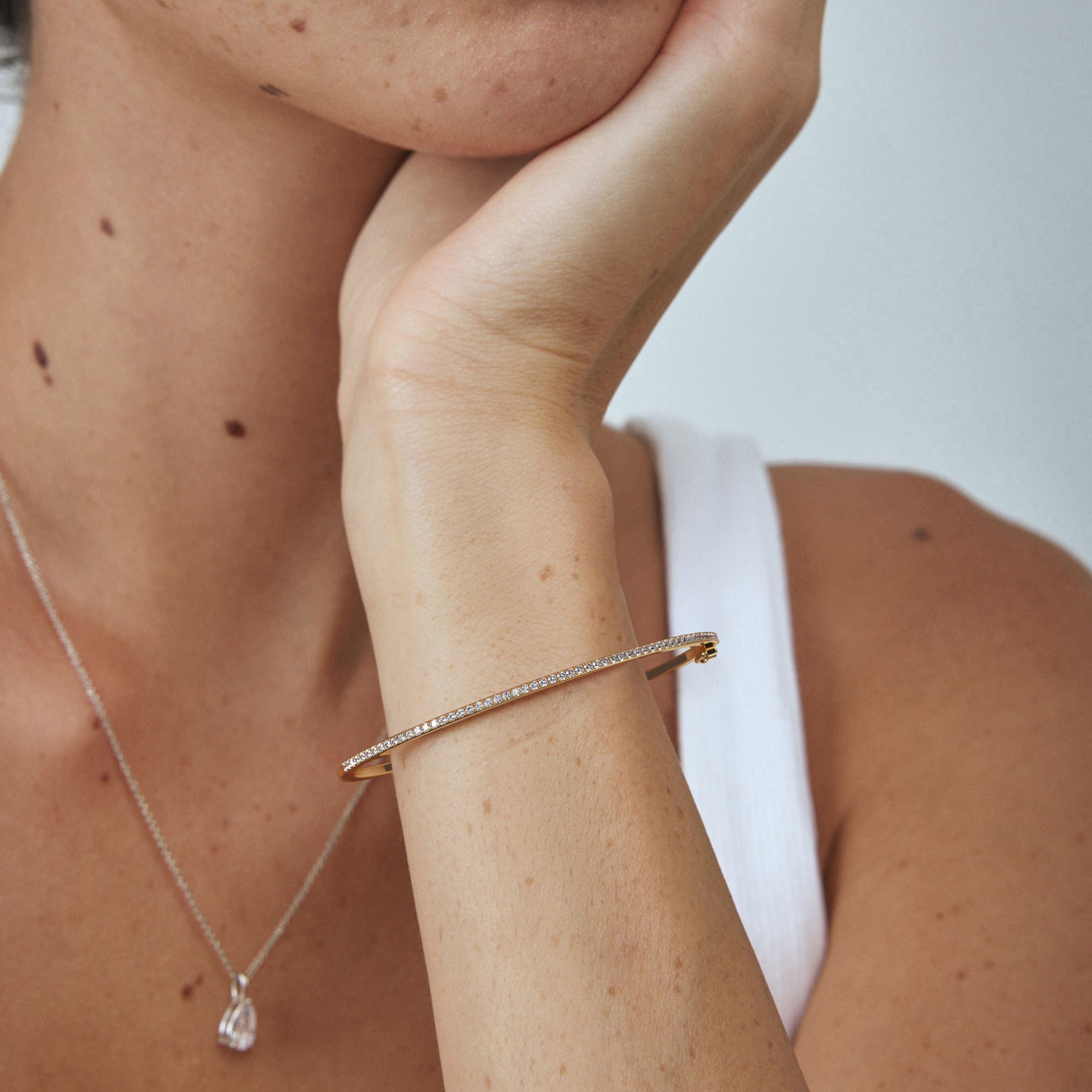 This beautiful pave set diamond bangle bracelet is designed with an easy open-close hinge and latch lock fastening. The oval shape offers everyday practicality and style and with a standard 2x2.3" (5x6cm) diameter, it ensures a comfortable fit while always keeping the diamonds on top.