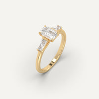 3-Stone 1 carat emerald cut diamond engagement ring, set with a high brilliance white and eye clean clarity enhanced natural diamond in solid 14K yellow gold.