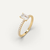 Pave 1 carat emerald cut engagement ring, set with a high brilliance white and eye clean natural diamond in solid 14K yellow gold.