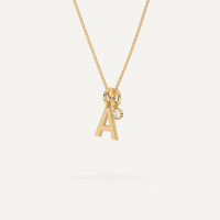 A personalized initial necklace pendant design featuring a letter A charm. This beautiful women's letter necklace is approx. 1cm tall and comes in solid 14k white or yellow gold with an optional 0.05 carat (3mm) diamond and an adjustable 16 inch - 18 inch chain.