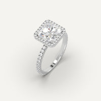 Halo 3 carat radiant cut engagement ring, set with a high brilliance white and eye clean lab diamond in solid 950 platinum.