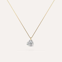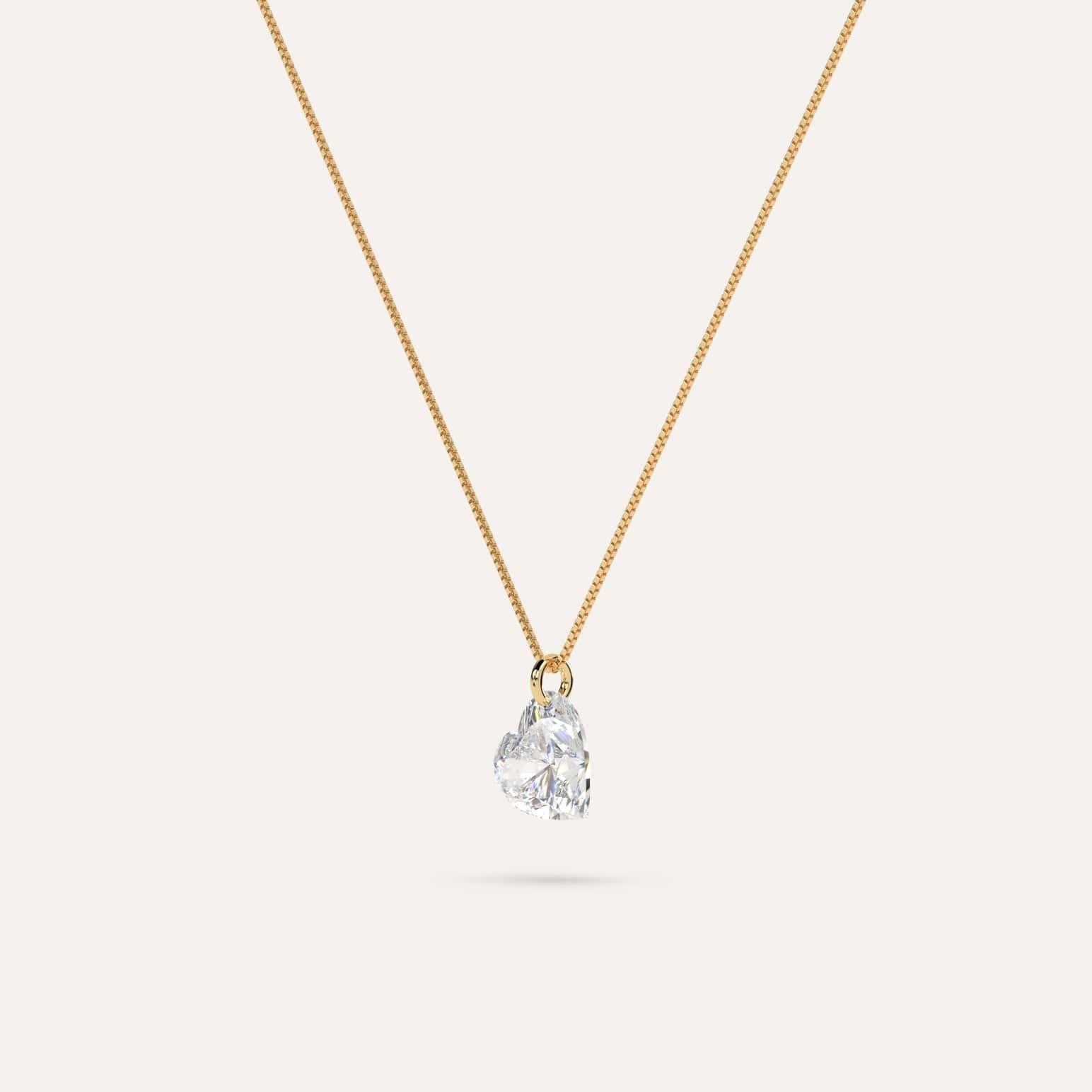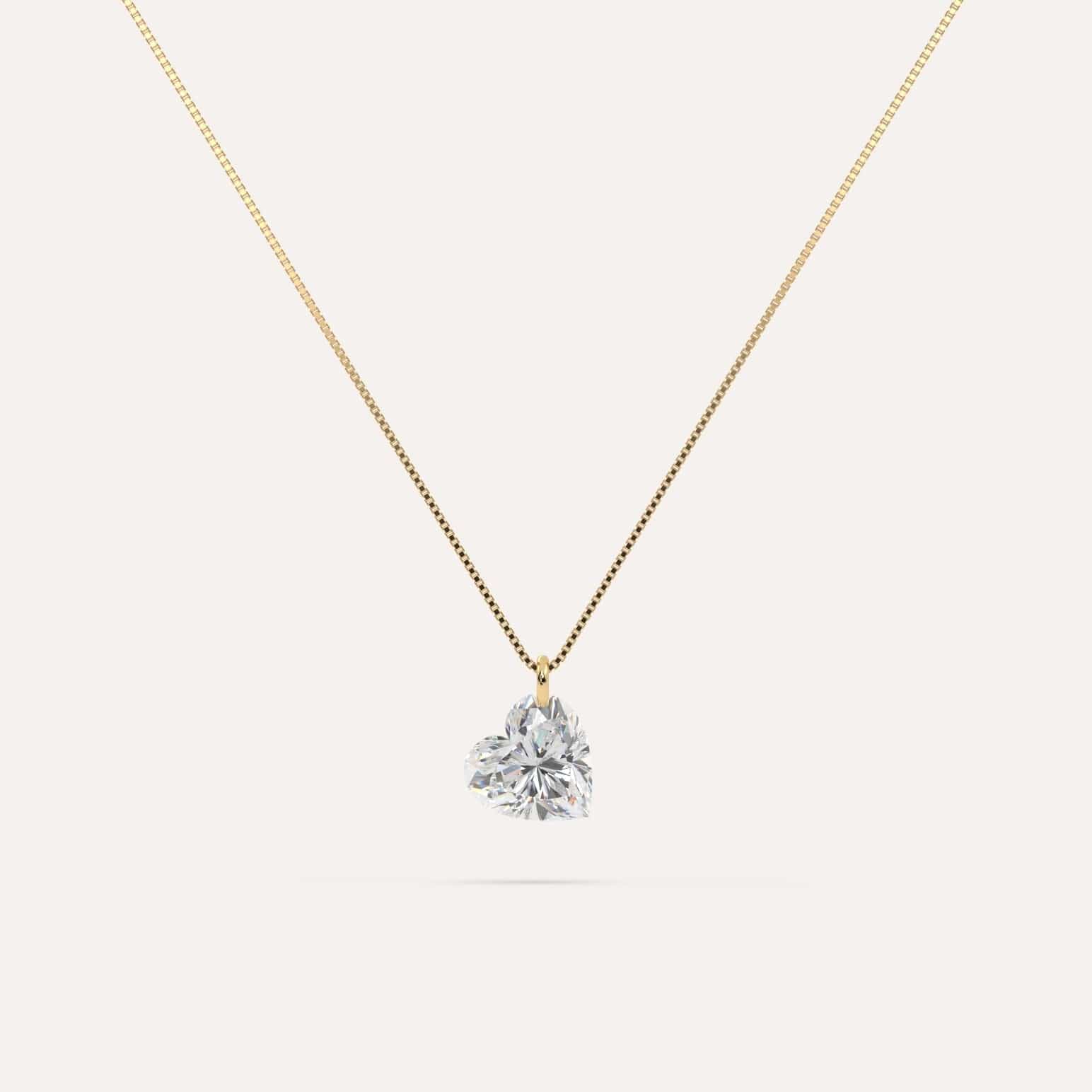Classic and ultra-minimalist floating diamond necklace with a stunning 1 carat real lab grown heart diamond in 14K yellow gold. The venetian chain necklace is 16 inches and passes through the diamond for a uniquely clean aesthetic. A real floating diamond!