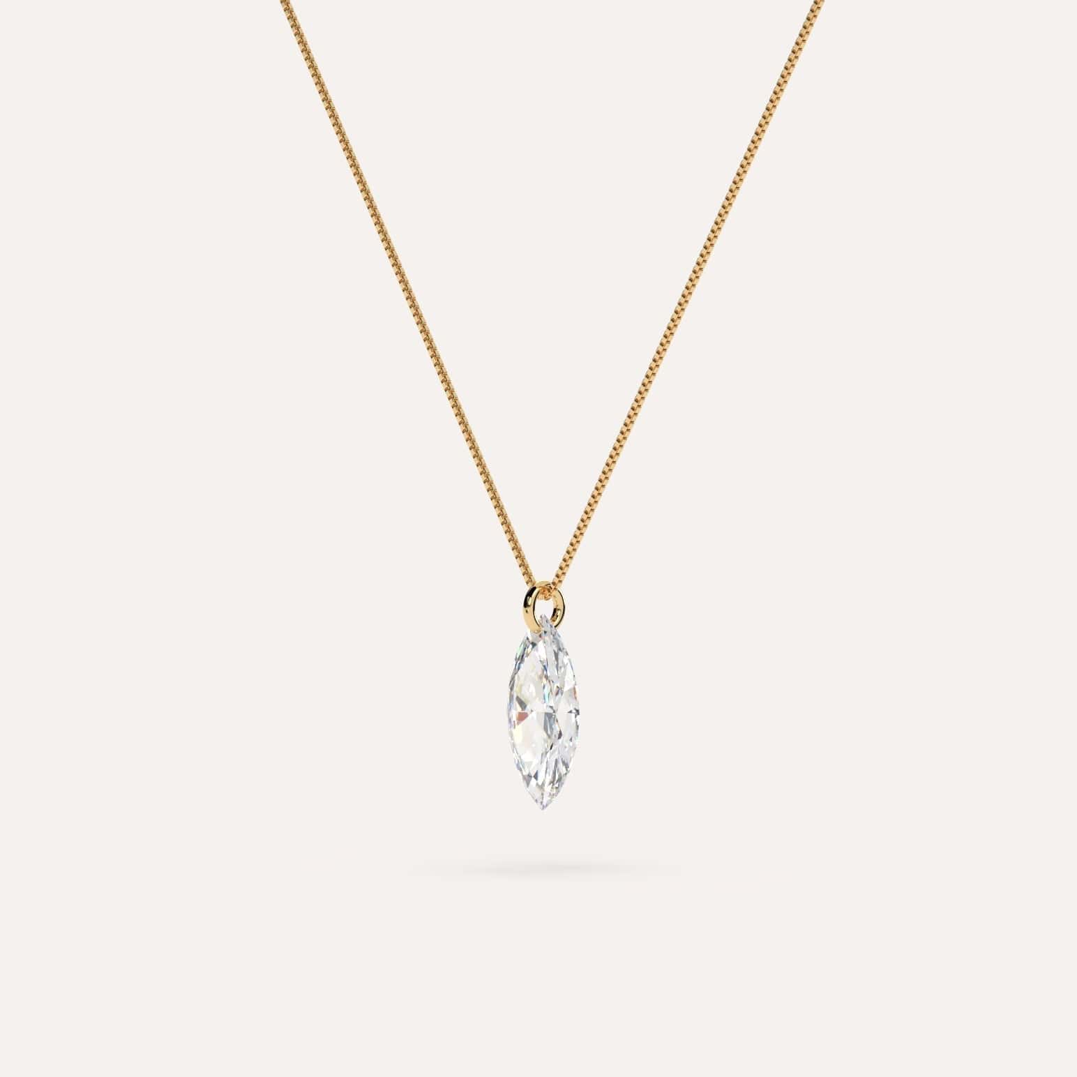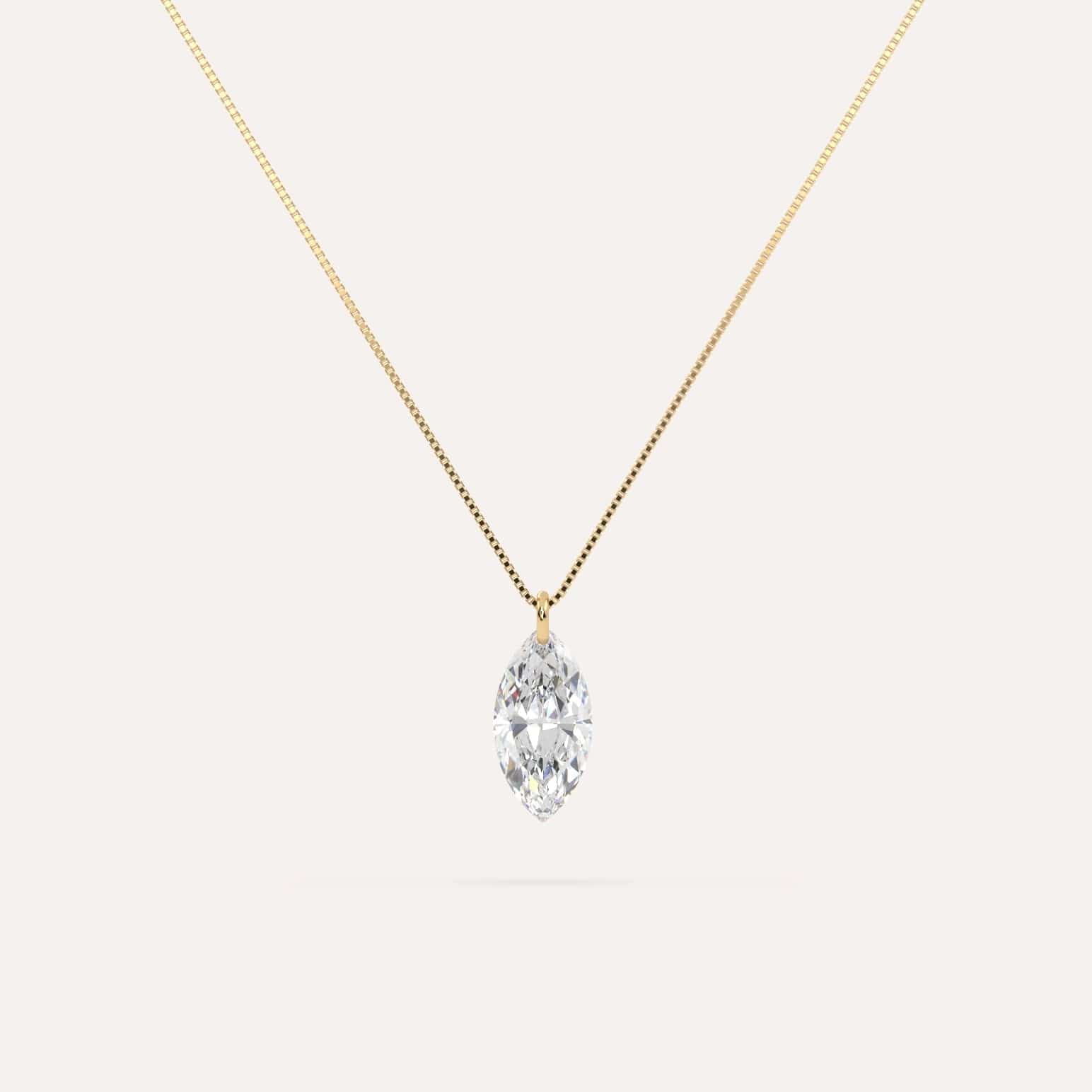 Classic and ultra-minimalist floating diamond necklace with a stunning 1 carat real lab grown marquise diamond in 14K yellow gold. The venetian chain necklace is 16 inches and passes through the diamond for a uniquely clean aesthetic. A real floating diamond!