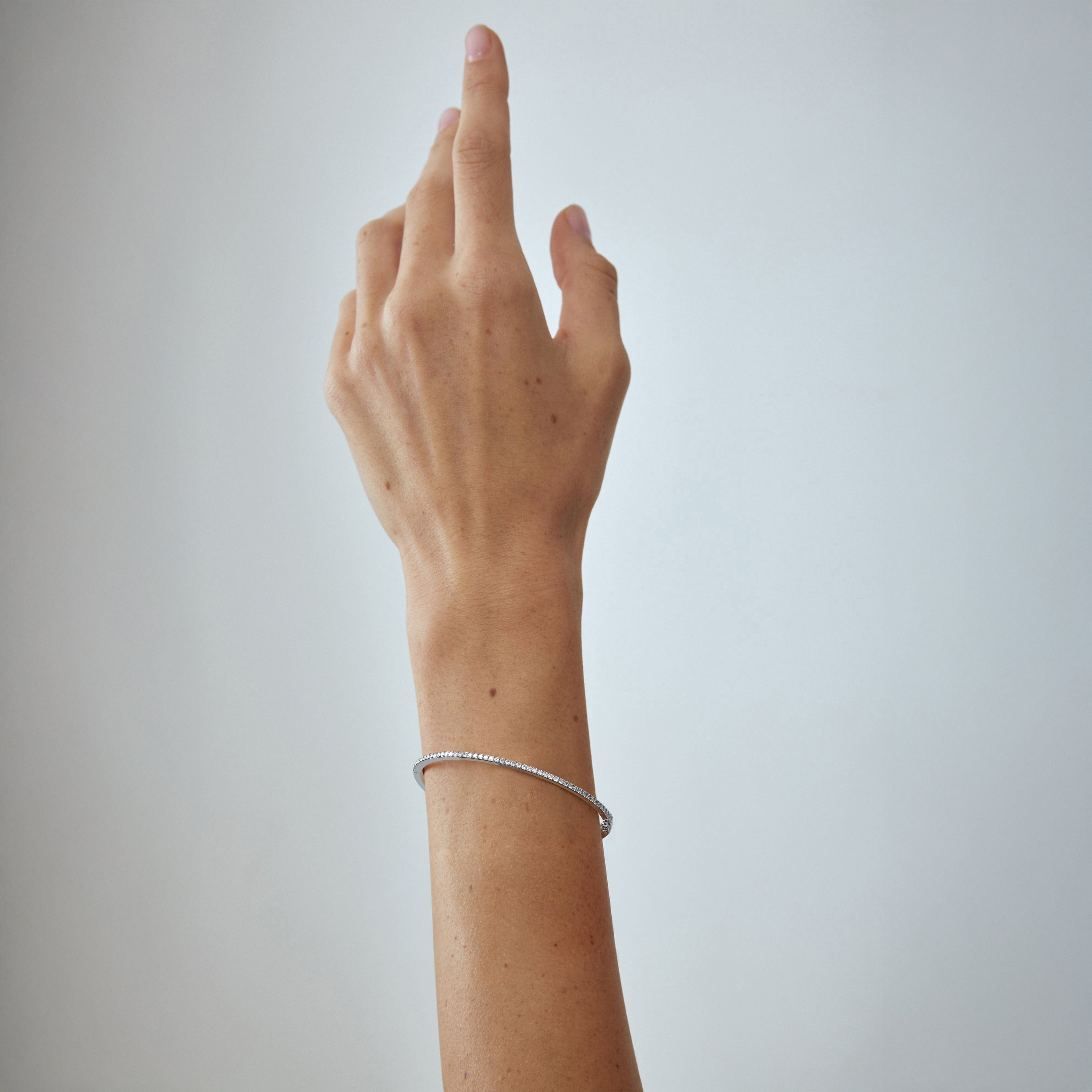 Classic 1 carat diamond bangle bracelet for women, set with high brilliance white and eye clean lab diamonds in solid 14K white gold.