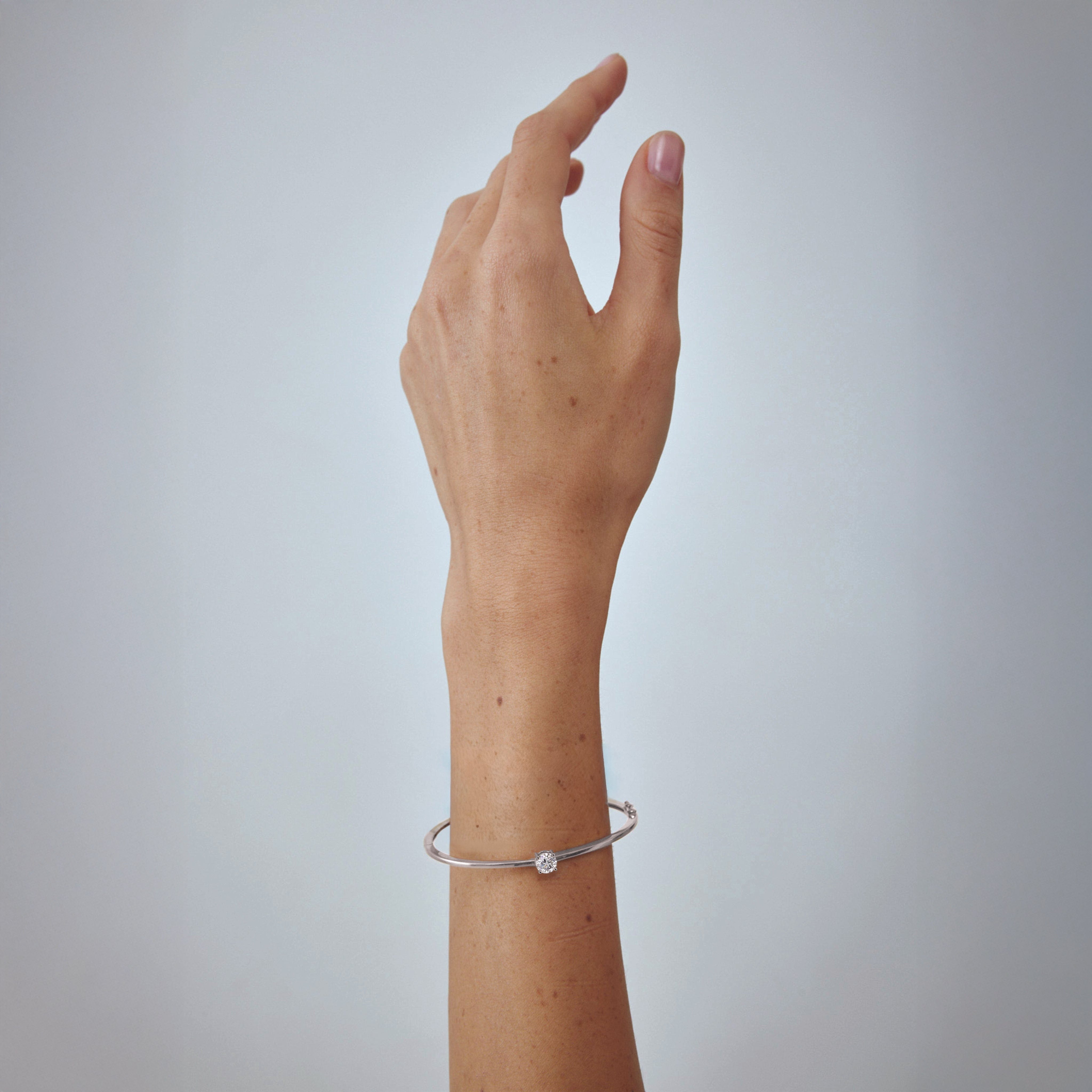 This minimalist solitaire diamond bangle bracelet is designed with a 2.3" (6cm) oval diameter that won't spin around and fits any wrist. Perfect alone or stacked, it's a versatile touch of sophistication.