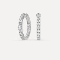 Timeless, everyday 3 carat total diamond 26mm hoop earrings for women, set with high brilliance white and eye clean natural diamonds in solid 14K white gold.
