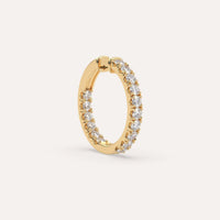 Timeless, everyday 1 1/2 carat total diamond 26mm, single hoop earring for women, set with high brilliance white and eye clean natural diamonds in solid 14K yellow gold.