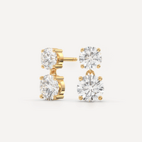 Experience the allure of our yellow gold diamond earrings, showcasing two round diamonds with secure butterfly push-backs. These handcrafted 14k gold earrings dangle gracefully, featuring either natural or lab-created diamonds. Each pair boasts high brilliance and eye cleanliness, with natural diamonds in F-G/SI1-SI2 and lab diamonds in F-G/VS1-VS2 grades.
