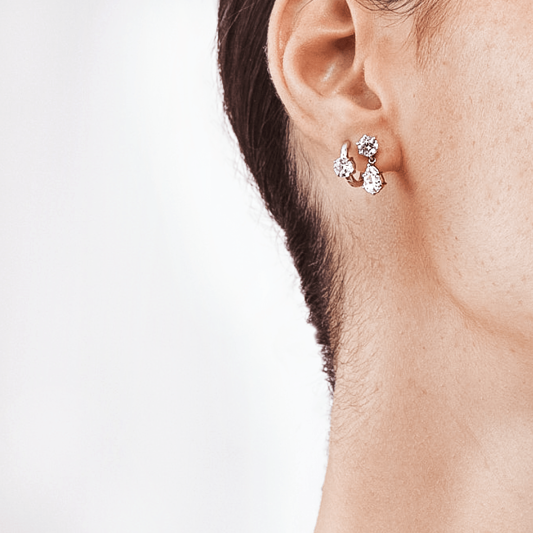 Yellow gold diamond earrings set in a drop design with a round diamond on top and a teardrop pear dangling below. Both natural and lab grown diamonds are high brilliance, white and eye clean. Natural diamonds come in F-G/SI1-SI2 grade while lab diamonds are F-G/VS1-VS2.