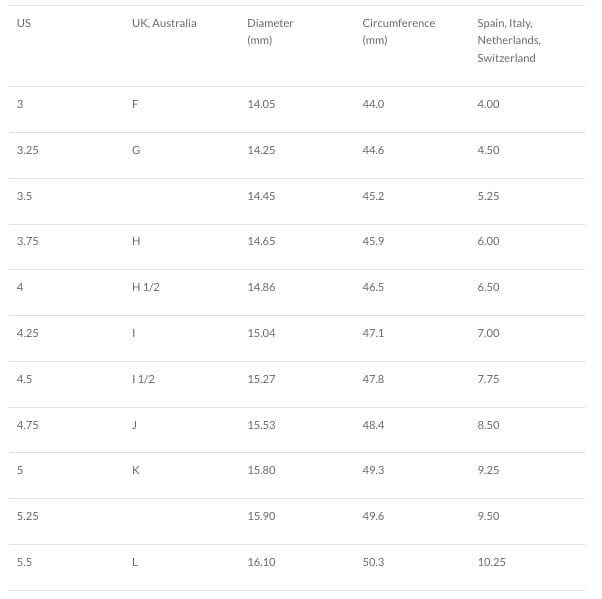 Ring size conversion chart