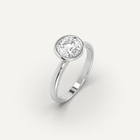 Bezel 1 carat round cut engagement ring, set with a high brilliance white and eye clean natural diamond in solid 14K white gold.