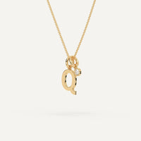 A personalized initial necklace design featuring a letter Q pendant. This beautiful women's letter necklace is approx. 1cm tall and comes in solid 14k white or yellow gold with an optional 0.05 carat (3mm) diamond and an adjustable 16 inch - 18 inch chain.